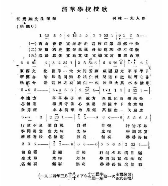 这就是今天清华师生最为熟悉的以“西山苍苍”开篇的《清华学校校歌》,歌曲节奏舒缓,曲风明净,歌词充满内涵,讲述了办大学、教大学、上大学的理想境界和为人为学的朴素道理,也激励着一代又一代的清华人。