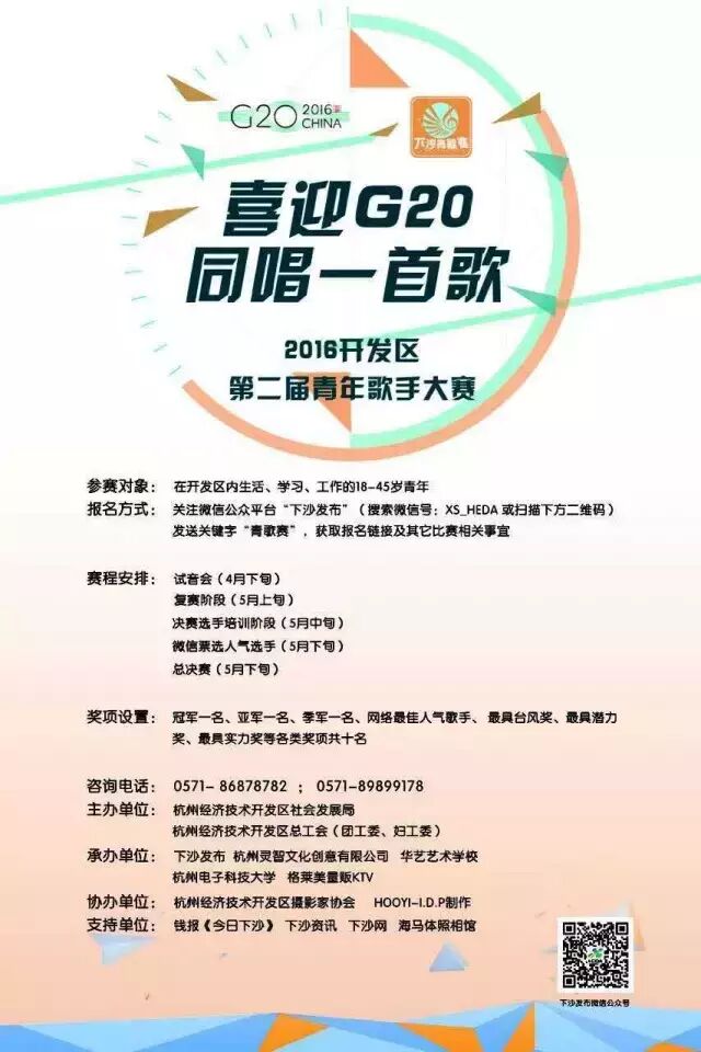 报名期间,通过微信公众平台“下沙发布”进行线上报名(搜索微信号:XS_HEDA 发送关键字“青歌赛”获取报名链接或者直接戳“阅读原文”填写报名表)