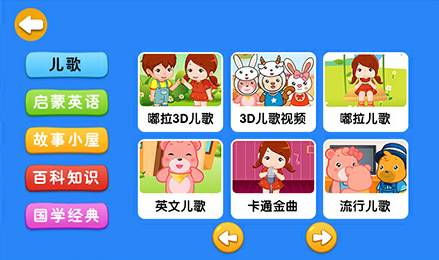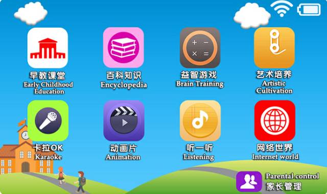 机器人深度定制八大优质早教模块,分别为:早教课堂、百科知识、益智游戏、艺术培养、卡拉OK、动画片、听一听、网络世界。