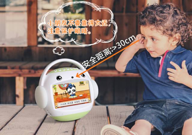 机身装有安全距离感应器,当宝宝距离屏幕小于30CM的时候会停止播放,并语音提醒护眼。