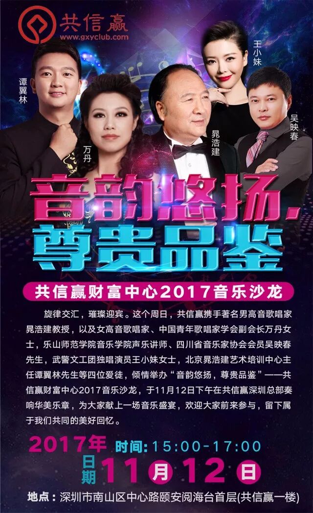 2017年11月12日下午,在深圳市南山区中心路颐安阅海台一楼共信赢深圳总部,共信赢携手著名男高音歌唱家晁浩建教授,以及女高音歌唱家、中国青年歌唱家学会副会长万丹女士,乐山师范学院音乐学院声乐讲师、四川省音乐家协会会员吴映春先生,武警文工团独唱演员王小妹女士,北京晁浩建艺术培训中心主任谭翼林先生等四位爱徒,倾情举办“音韵悠扬,尊贵品鉴”——共信赢财富中心2017音乐沙龙。奏响华美乐章,为大家献上一场音乐盛宴,留下属于我们共同的美好回忆。