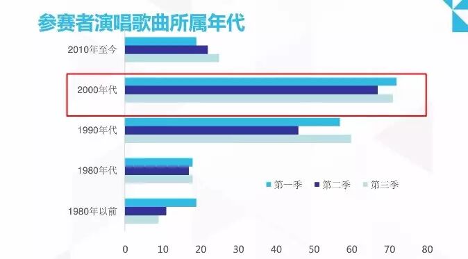 数据显示,《中国好声音》选手翻唱的歌曲里,21世纪前创作的老歌比例超过50%,剩下的部分,除了英文歌和萧敬腾、林宥嘉、苏打绿等年轻一代台湾艺人的作品,基本上都是国内的“小众音乐”。