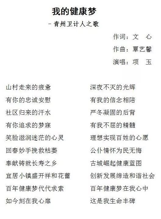 健康,是一个永恒的话题。:“没有全民健康,就没有全面小康”。:“推进卫生与健康事业,改革发展、建设健康中国,是关系现代化建设全局的重大战略任务”。十九大报告中更是将实施“健康中国”战略,推进“健康中国”建设提到了前所未有的高度。为进一步展现近年来我市卫生计生工作取得的辉煌成果和巨大变化,大力推进“健康青州”品牌建设,青州市卫生计生局推出属于卫计人自己的行业歌曲《我的健康梦》-青州卫计人之歌,生动讲述了卫计人的爱与情、苦与乐,唱出了卫计人的心声,唱出了卫计人的品格与风采。