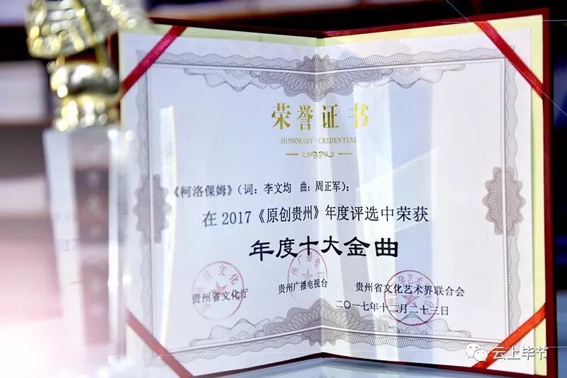 12月23日,第二届原创贵州年度颁奖典礼在贵阳大剧院隆重举行,2017“年度十大金曲”揭晓,毕节市广播电视台台长李文均作词、贵州工程应用技术学院艺术学院院长周正军作曲的原创歌曲《柯洛倮姆》斩获“年度十大金曲”。