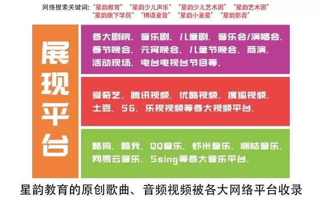 经考核、录取和培养的星韵少儿艺术团的小童星们将有更多的参加大型舞台演出的机会,艺术团更为明星级正式团员未来的商业演绎道路提供专业策划、包装、经纪服务。