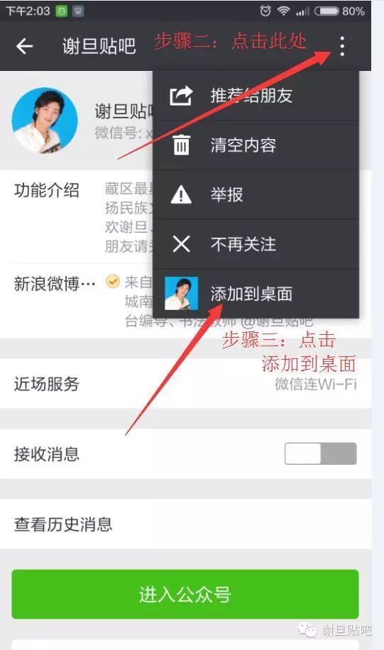 2. 继续点击右上角菜单,点击添加到桌面,如图: