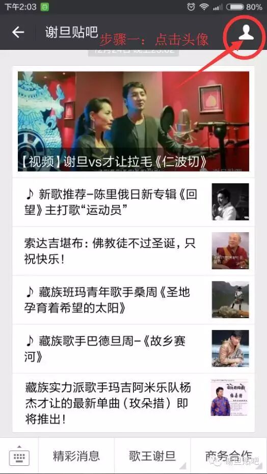 首先打开“谢旦贴吧”微信主页面,点击右上角头像,如图: