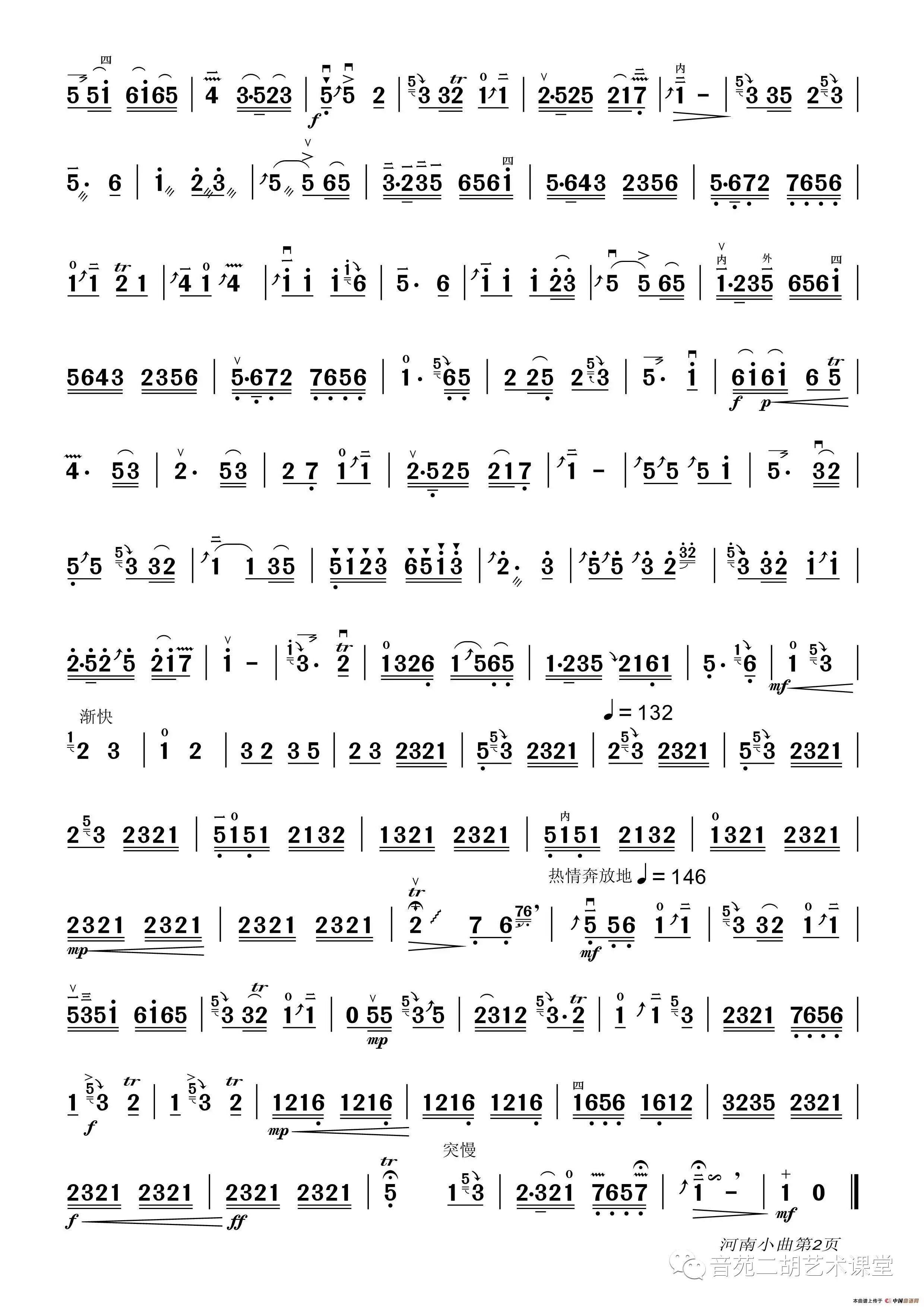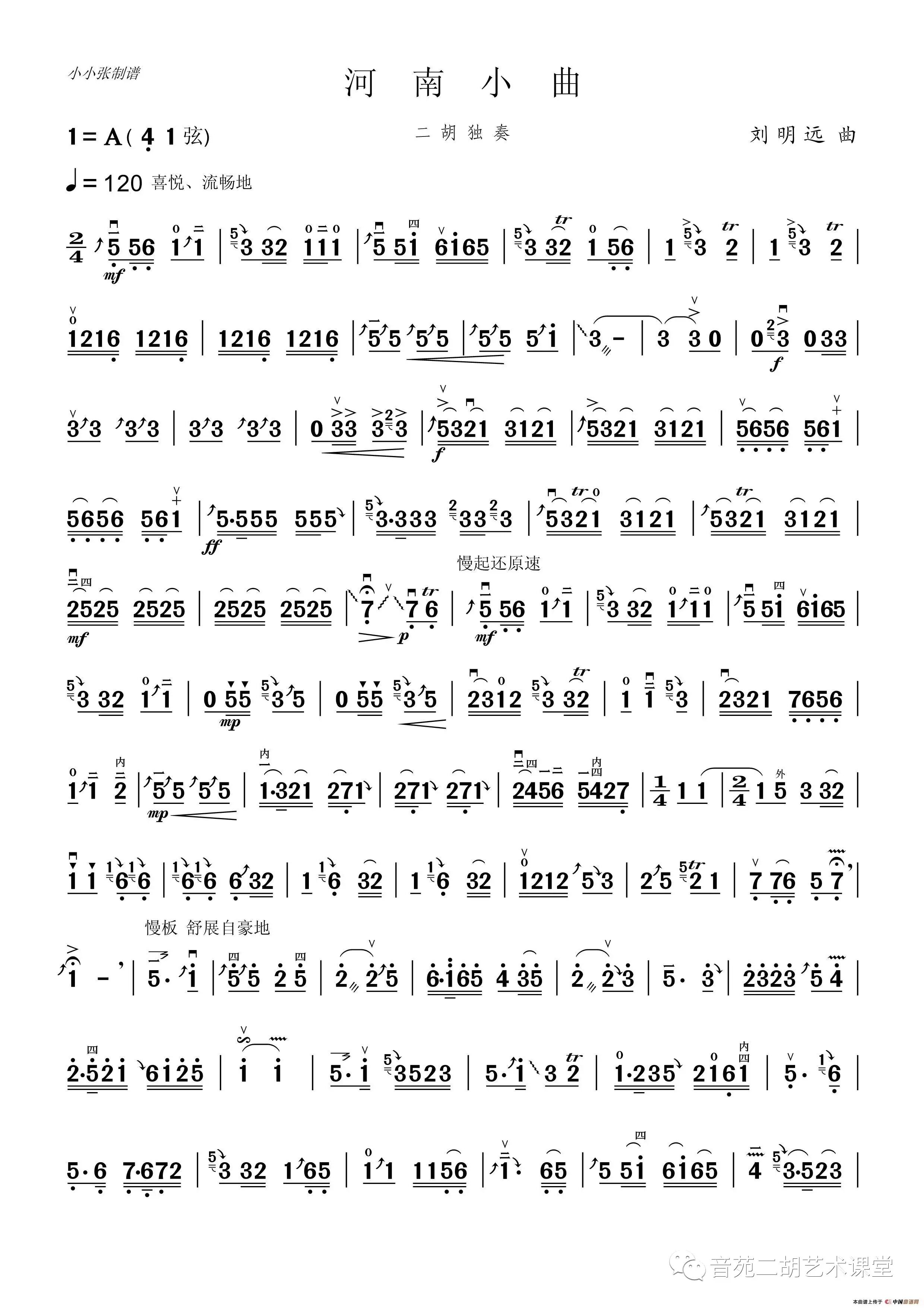 《河南小曲》是胡琴大师刘明源先生以河南曲剧音调为素材创作的一首著名二胡曲,它以清新的旋律、浓郁的地方风味和丰富的演奏手法,生动地表现了河南人民对家乡的赞美和主人翁的自豪感。乐曲借鉴了坠胡的许多演奏技巧,大大丰富了二胡的表现力,为特色二胡曲的创作树立了典范。