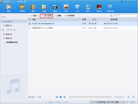 4.切换到【音乐】界面下的"铃声"选中该铃声将其同步到设备中。