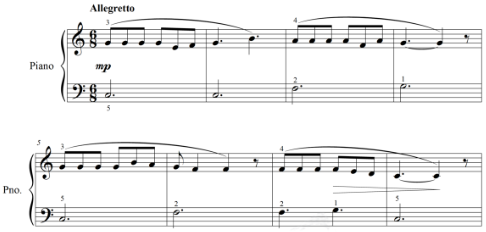 7.我们弹奏时看清左右手的谱号,按照标明的指法来弹。