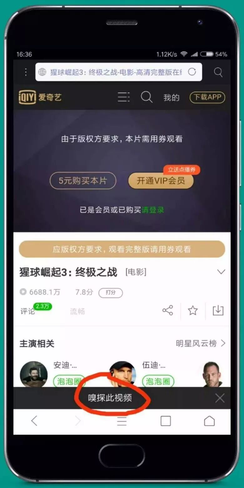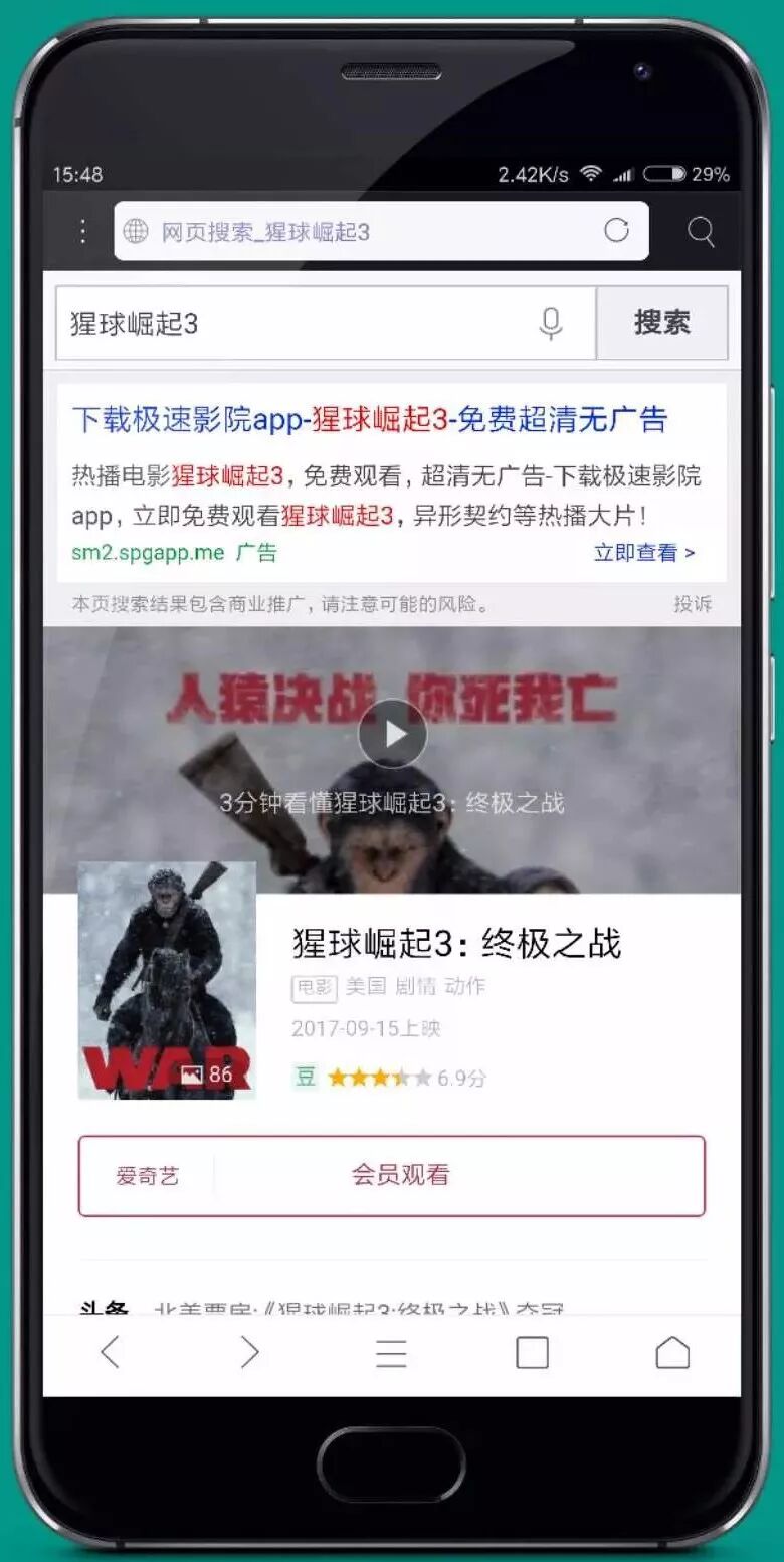 这里我以电影“猩球崛起3:终极之战”为例,目前在爱奇艺是需要用会员才能观看的,搜索后的内容就跟普通浏览器搜索的一样,找到视频来源,不管是爱奇艺,优酷还是其他平台,点击进去就行了,这里显示的是【爱奇艺会员观看】,然后点击进去。