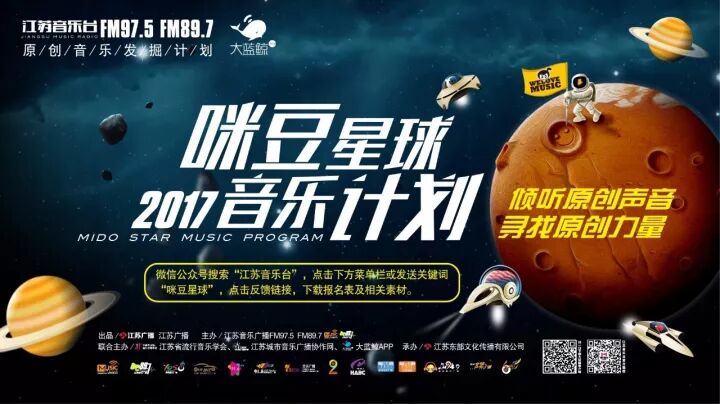 咪豆星球音乐计划将开启“原创音乐”模式,由江苏音乐广播发起,借由全省16家优质音乐平台,挖掘从未曝光的好声音。同时引入专业音乐人作为评委,让不同风格的好音乐,都不会错过被欣赏的机会。