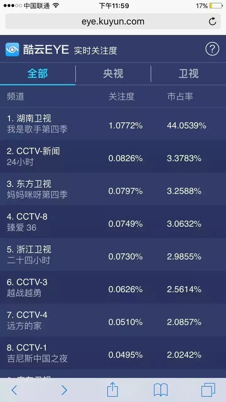 昨日《我是歌手4》播出“歌王之战”,李玟斩获本季歌王桂冠,张信哲、黄致列入三强,羽泉、韩磊和韩红献上诚意满满的歌王秀,7位歌王候选人+15位帮唱嘉宾+3季歌王,乐坛“大半壁江山”的组成了《歌手》史上最豪华总决赛阵容,节目全国网收视率1.49,收视份额5.86%,成为当晚收视份额最高的节目,同时酷云实时数据平均市占率破20%,份额峰值破45%,在当晚节目中始终位居第一,话题#我是歌手#在新浪微博“综艺榜”排行榜中排名第1,在“热门话题”排行榜中排名第1,霸气热度再次证明了节目强大的影响力,也被观众赞为四季以来最精彩的总决赛,无愧本季度“综艺之王”的称号。