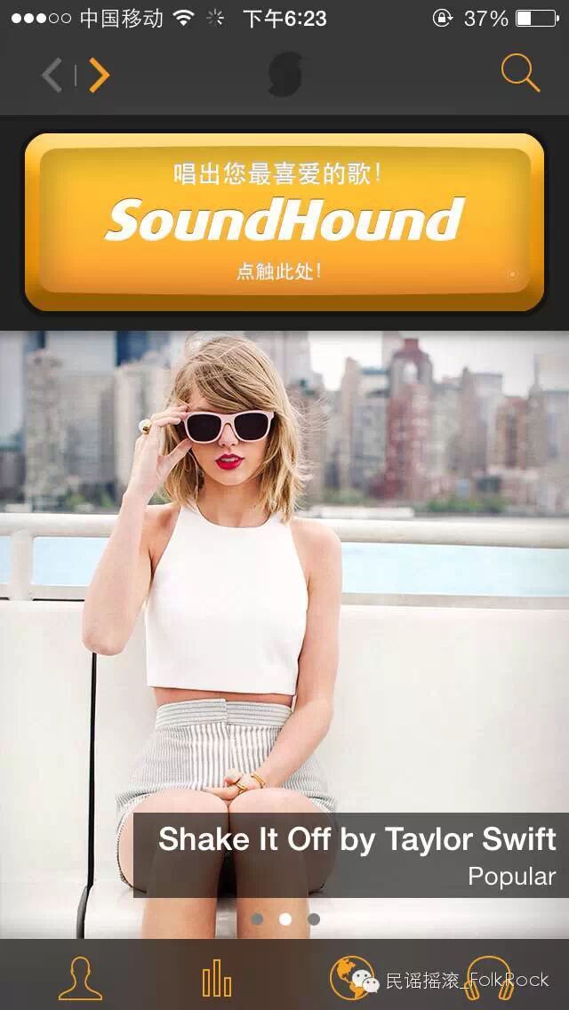 首先,你可以下载一个应用“SoundHound”。把它翻译过来有个很屌的名字:猎曲奇兵。打开界面后,你会看到明显的黄色区域“SoundHound”。