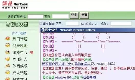 那时足不出户,就可以和天南海北的人海阔天空,那时,网游还没有兴起,聊天室GG、MM、886、大虾等新词不断冒出高峰时候,网易聊天室有7.5万同时在线,直到2008年,网易才停止了聊天室的运营。
