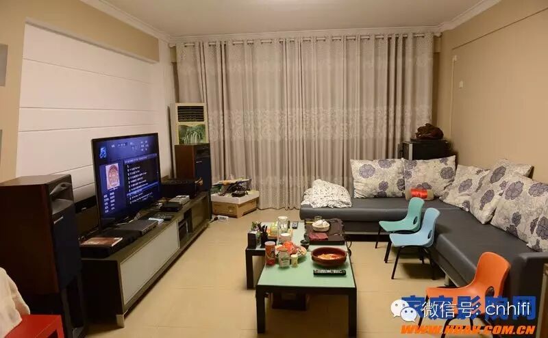 我就放在客厅了,没有专门弄听音室,希望其成为我家庭娱乐的系统,而不是个人爱好的玩具.客厅空间有限制,只能大概摆一下,对定位啥的估计不太有利。吸音方面没有专门弄,因为客厅里面东西已经很多了,角落都有东西,沙发什么都是布的,我看也不利于驻波什么的形成。