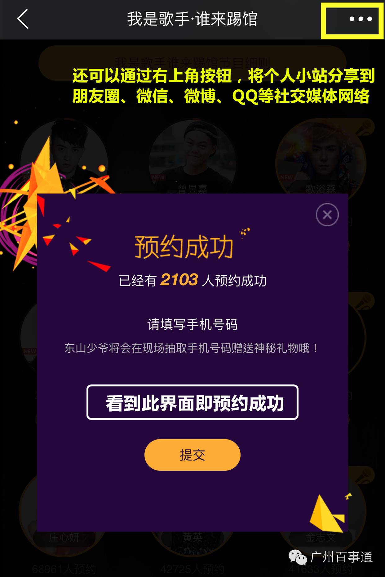 5.登录后,就会看到预约完成的页面,填写手机号码(选填),有机会获得我是歌手门票一张。你还可以通过右上角按钮,将个人小站分享到你的朋友圈、微博、微信、QQ等社交媒体软件。