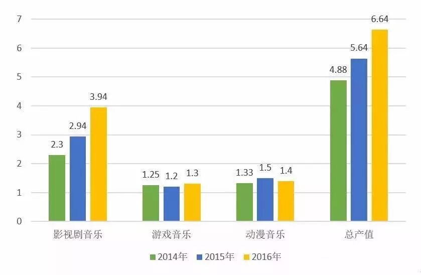2016年,我国影视剧、游戏、动漫音乐的总产值约6.64亿元,同比增长17,7%。其中游戏音乐收入在约1.3亿元,动漫音乐收入约1.4亿元,影视剧音乐产业总值约为3.94亿元,同比增长34%。VR、AR等新科技给游戏、动漫产业注入新的活力,而影游联动、游娱联动和动娱联动创新模式的不断涌现,也给产业联动发展带来了广阔空间。