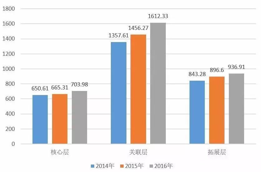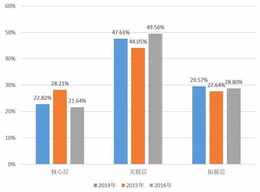 △图1-15 2014-2016年音乐产业各层占比情况对比(单位:亿元)