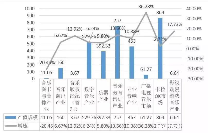 △图1-16 2016年中国音乐产业各细分行业产值与增长对比 (单位:亿元)