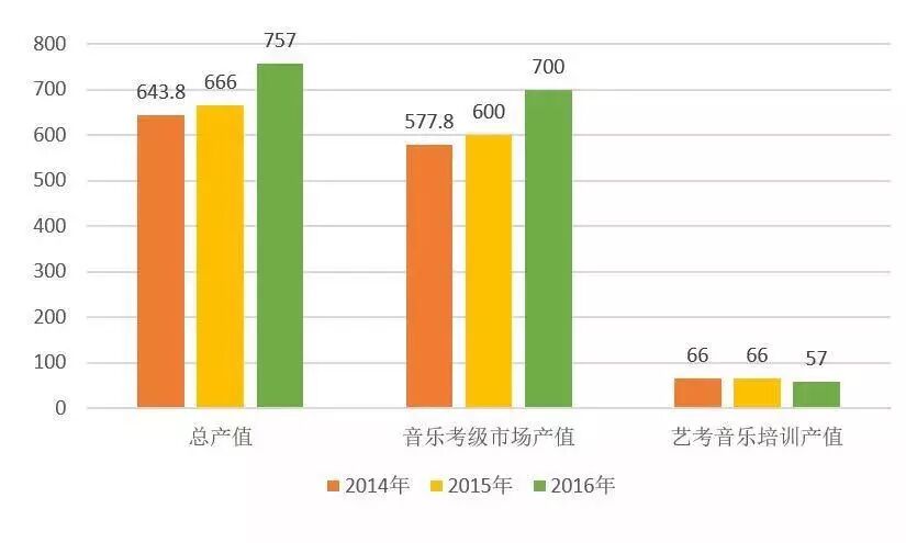 2016年音乐教育培训总产值为757亿元,同比增长13.6%。其中,音乐类艺考报名人数约为11.4万人,艺考音乐培训产值57亿元,同比略有下降;音乐考级报名人数达135万人,社会音乐考级培训总值约为700亿元,同比增长16.6%。新媒体技术的广泛应用,金本的持续注入带动音乐教育培训市场的新一轮行业洗牌,综合化、多元化的大型连锁经营培训机构成为新趋势。