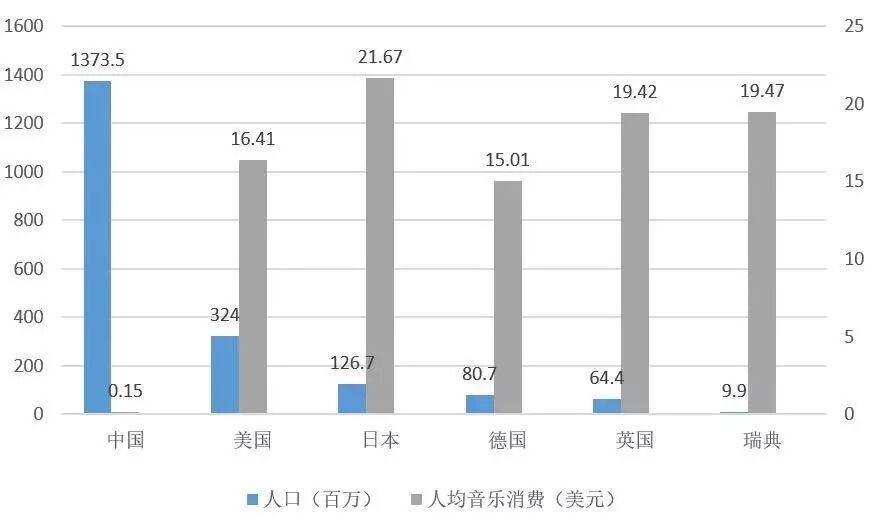 △图1-18 全球数字音乐产业数据分析(人口和人均消费图)