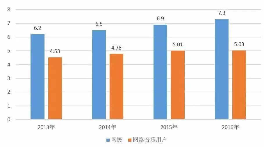 △图1-172013-2016年中国网民及网络音乐用户规模对比图(单位:亿人)