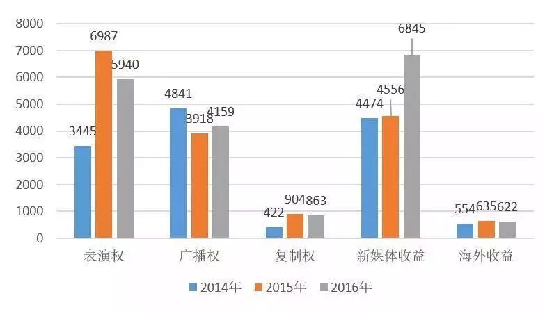 △图1-3 2014年—2016年音乐版权各项权利收入对比图 (单位:万元)