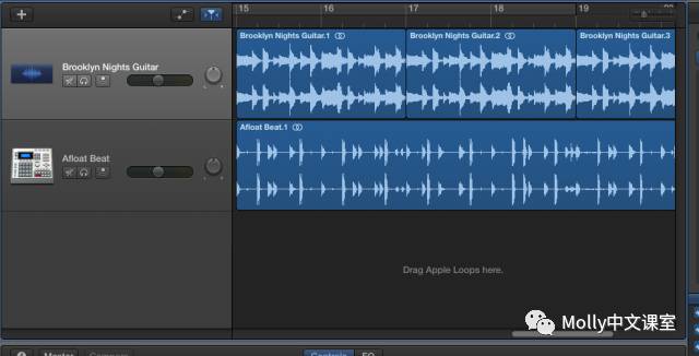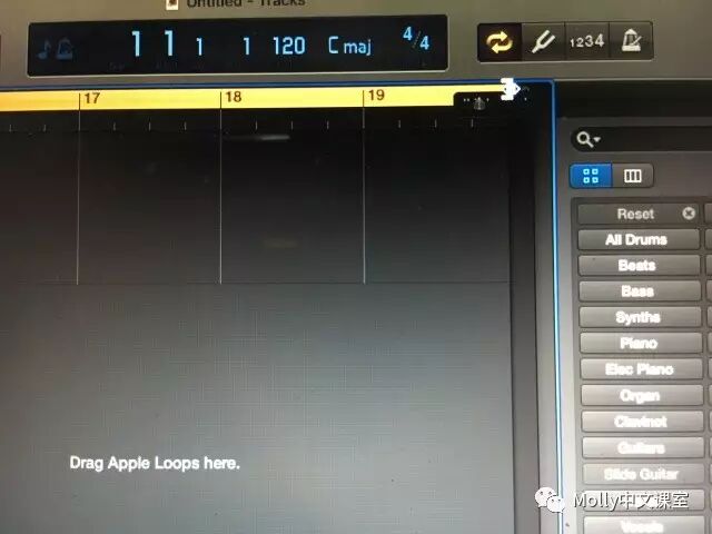 (2)Garageband的时间轴默认只到19段,时间非常短,所以点击第19后,看到一个箭头,可以直接往后拉倒更长的时间,我通常会拉倒200。