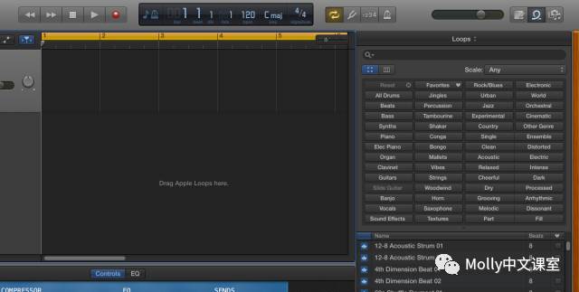 3. 之后可以制作音乐了,你会看见右侧“loops”里面有各种乐器的音乐素材,你可以根据自己的喜好以及课件的内容选取音乐,拖到左边的银桂上。
