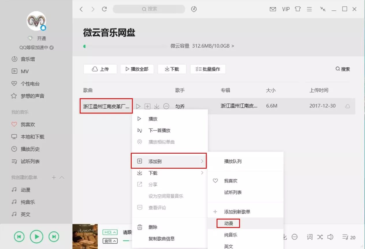4.把上传成功的歌曲加到你自己创建好的对应歌单!