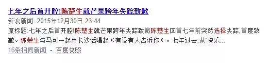 陈楚生去年底出来向芒果道歉,表示那时候用失踪的方式和天娱解约是不恰当的做法: