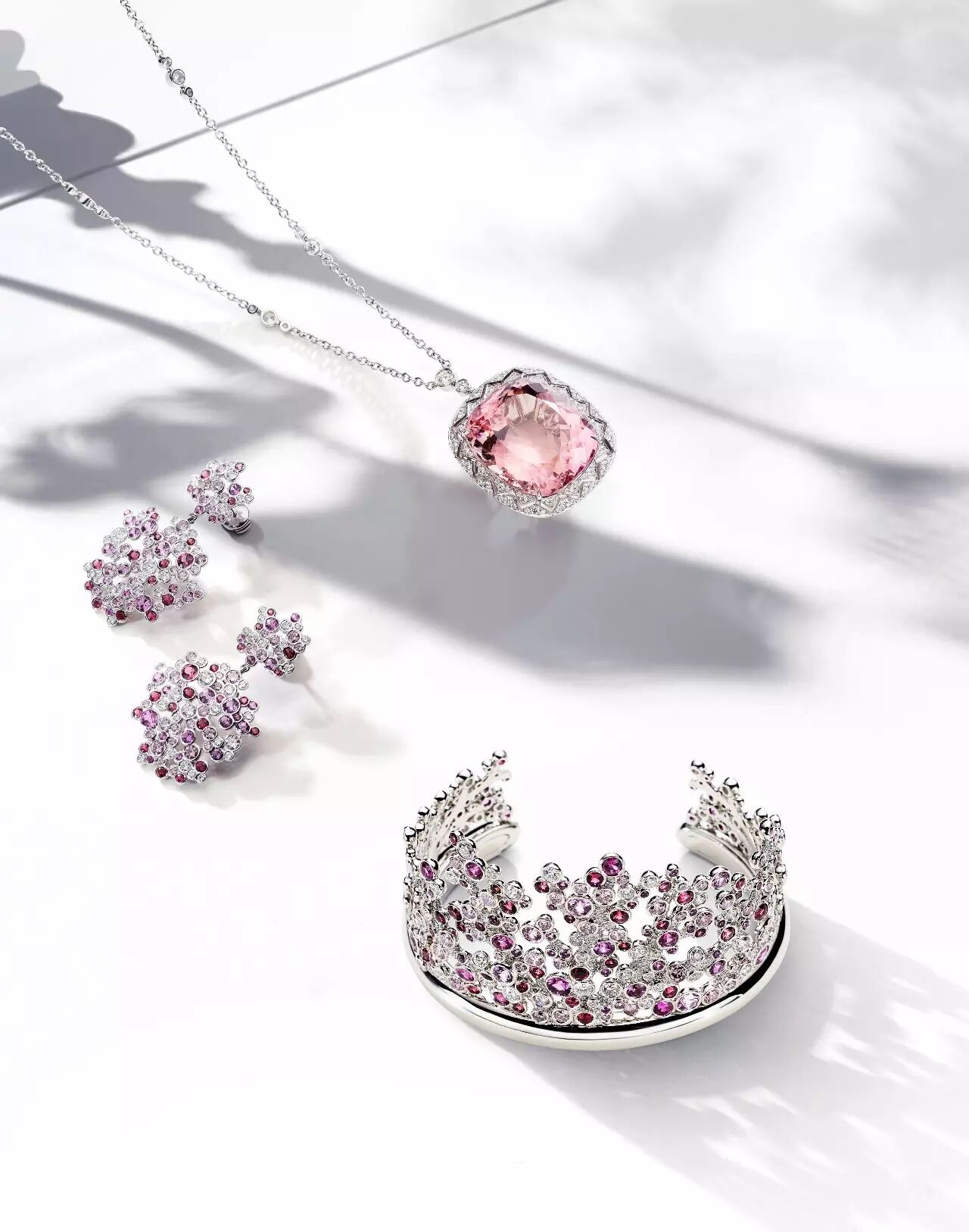 列铂金镶嵌圆形粉钻、粉色蓝宝石、尖晶石和钻石耳坠