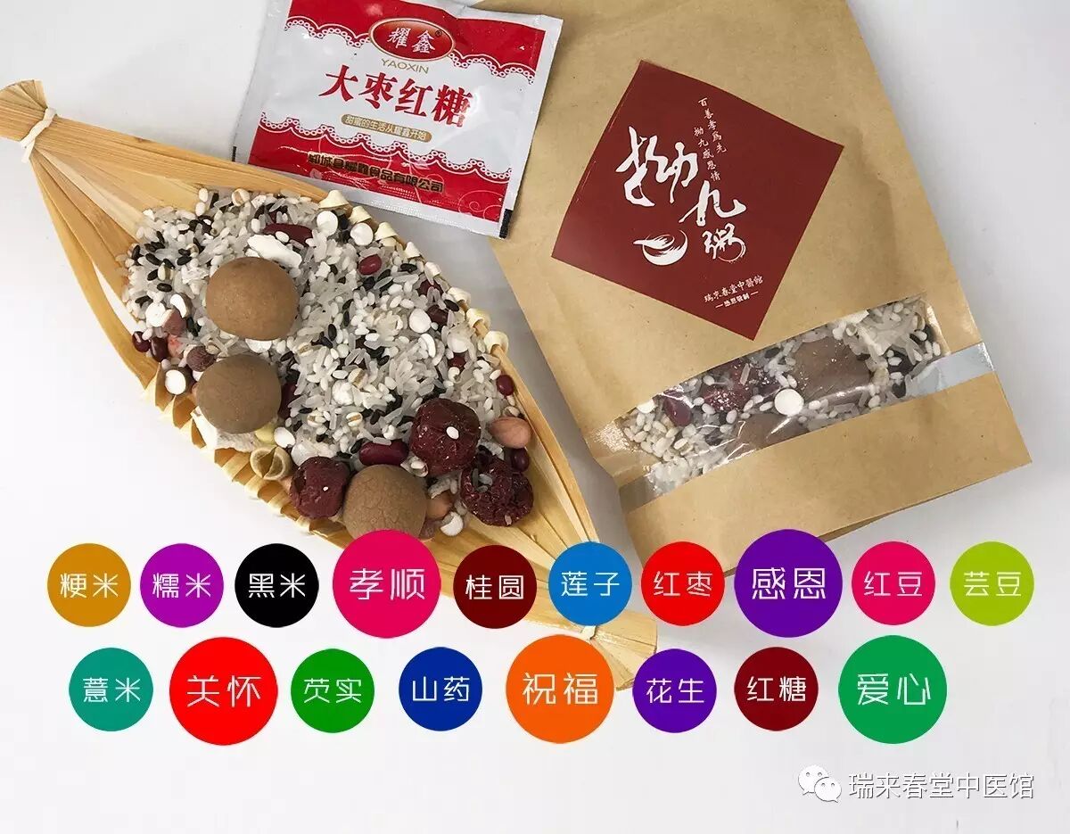 瑞来春堂拗九粥配料在福州传统拗九粥配料(糯米、花生、红枣、红豆、桂圆等)基础上特别加入健脾益气的山药、莲子、薏米、芡实、黑米等,更加营养健康,更适合老年人食用。