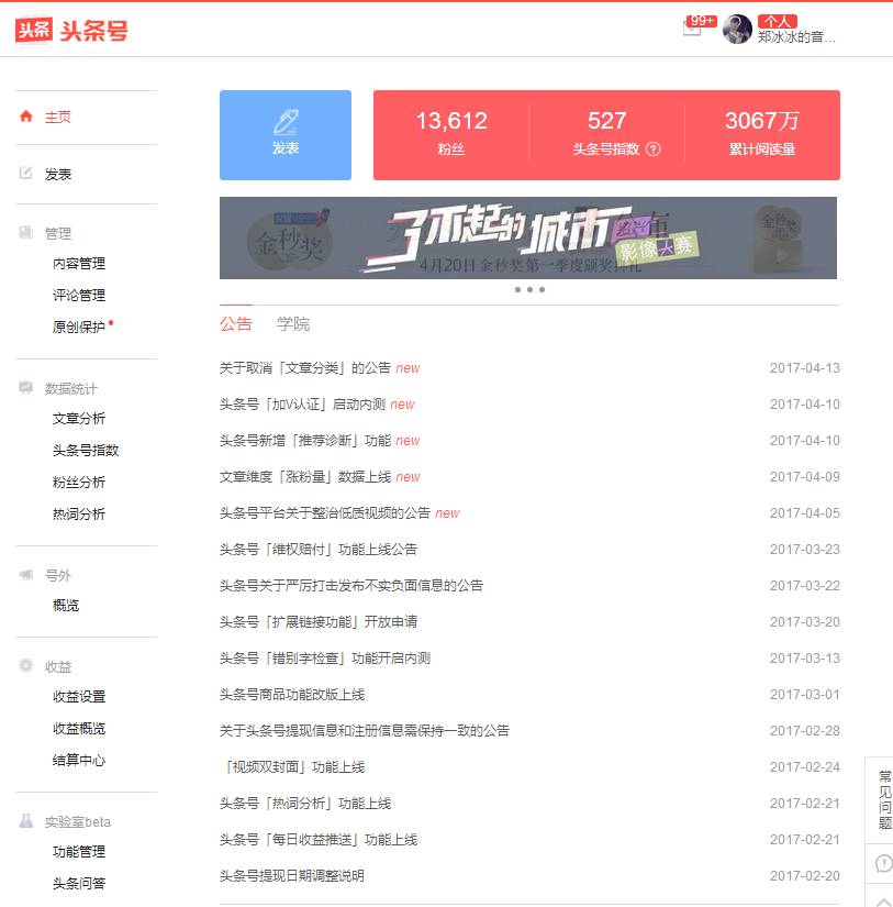 2016年8月份 入驻今日头条,获得原创作者认证,多个作品受到首页推荐,入驻一周点击破十万,广告分成过千,入驻3个月,订阅快3000,阅读量快700万,第三个月单月广告分成破万元,目前后台订阅量是一万9千粉丝,4200多万点击,8万多广告分成