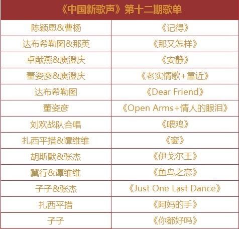 《中国新歌声》周杰伦和刘欢两队组内赛冠军揭晓,董姿彦、扎西平措脱颖而出。本期战况激烈,庾澄庆分别帮唱卓猷燕和董姿彦,“一个刚,一个柔;一个狂风暴雨,一个云淡风轻。”;谭维维全情投入帮唱冀行,时而小鸟依人,时而素手搭肩,场面十分火热;张杰张杰甘为绿叶衬托子子、胡斯默。