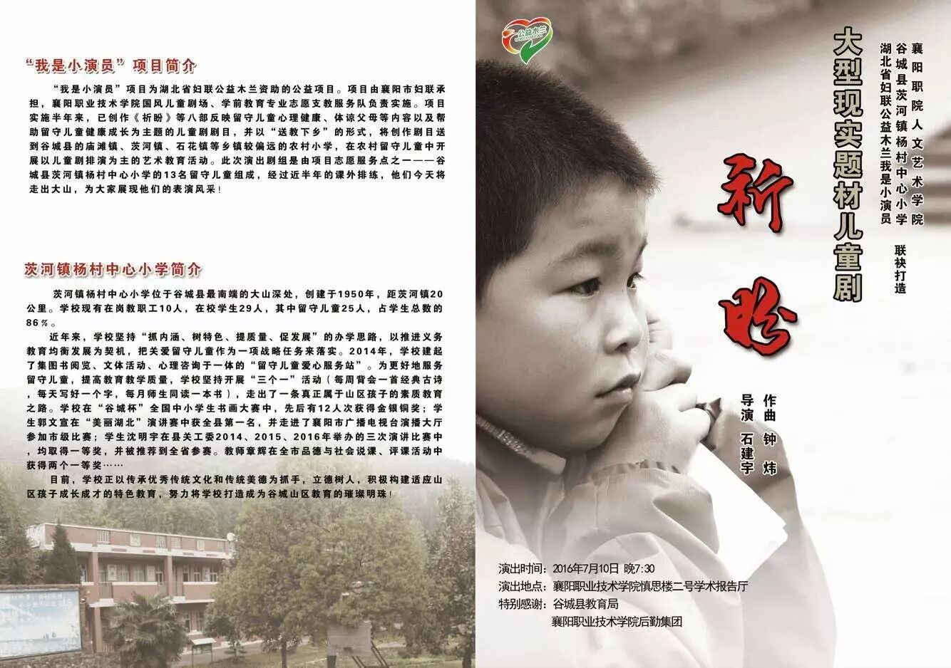 ▲湖北省公益木兰项目襄阳市首部现实主义题材儿童音乐剧《祈盼》,全剧作曲:钟炜。