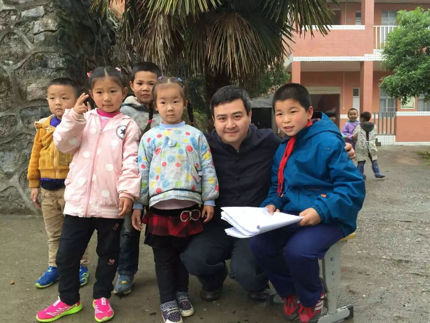 ▲钟炜与留守儿童合影