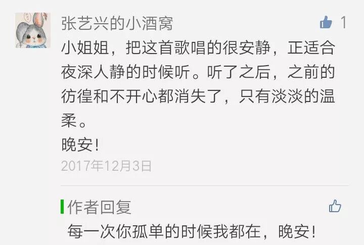 颁奖原因:这位小可爱也是天使本人了,刚刚在准备写推送时,还看到她给我留言说新年好,估计还不知道这个小惊喜。其实也是她的话让我很触动,让我发现原来自己的歌也是很有魔力的。也印证了我最初的想法,就是做专属于你们的音乐盒,在孤单时陪伴你们~