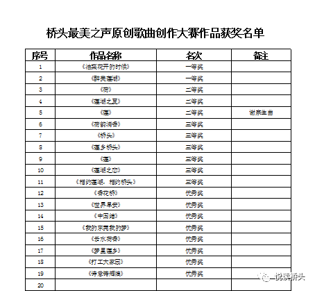 经过大赛评委们专业认真的评选,评选出作品一等奖2首,二等奖3首,三等奖6首,优秀奖8首。获奖歌曲名单如下: