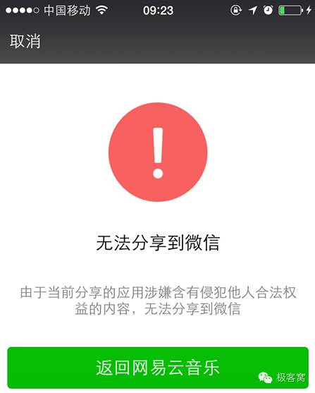 与此同时,网易云音乐涉嫌含有侵犯他人合法权益的内容,无法将音乐分享给微信好友或分享到朋友圈。