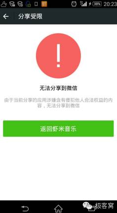 2月3日,马云辛辛苦苦攒钱买下的虾米音乐和天天动听,无法将音乐分享给微信好友或分享到朋友圈。