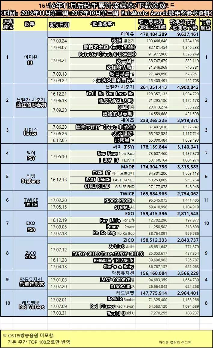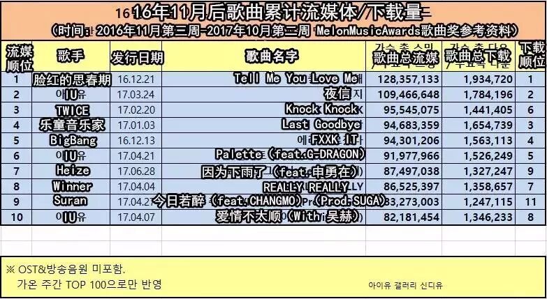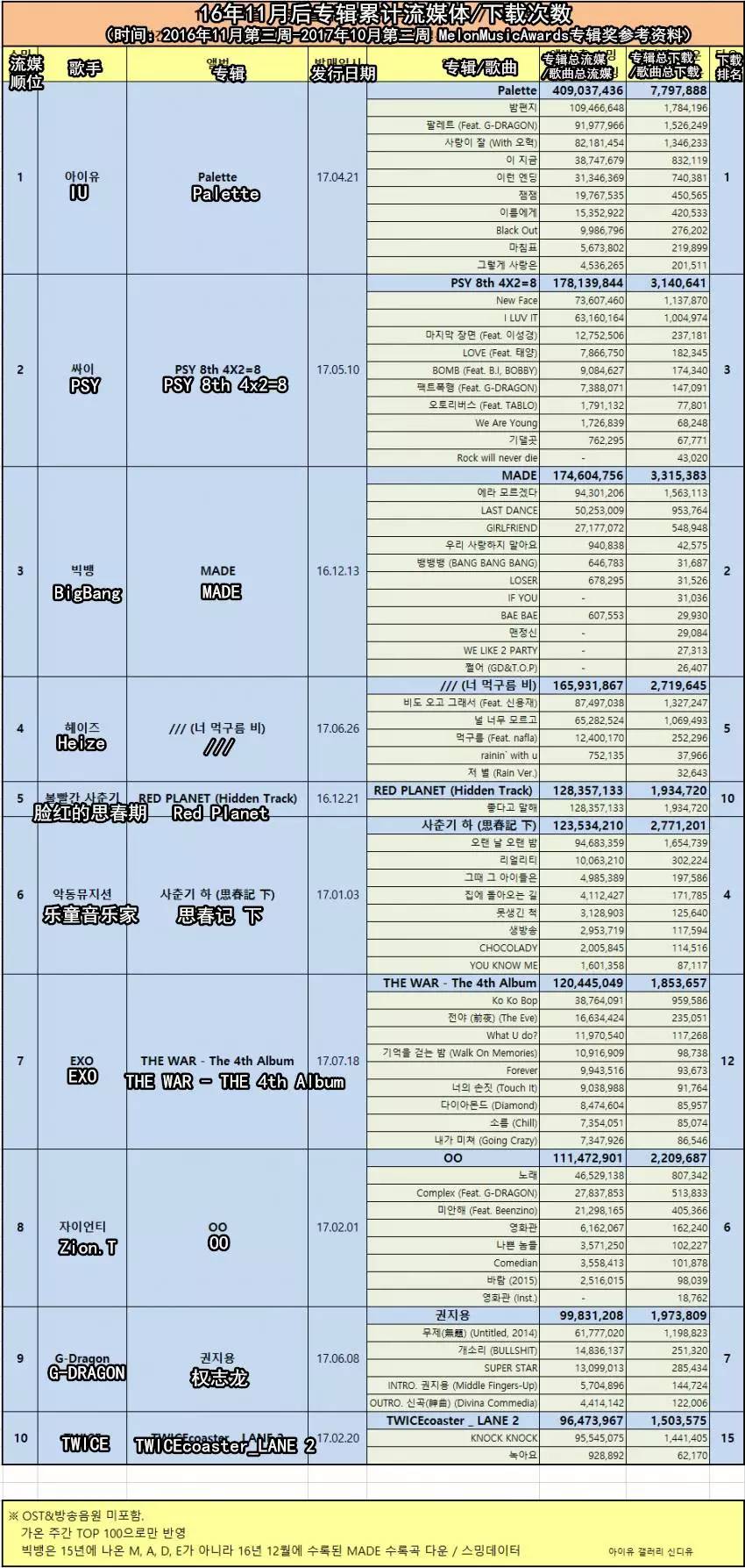 G榜:“gaon排行榜”是由韩国音乐内容产业协会负责运营管理。排行榜根据韩国2000万付费音乐用户的消费数据,综合统计韩国目前所有音乐媒体的音乐排行榜以及移动通讯运营商的无线音乐销量,以周为单位公布唱片、数字音乐的销售数据,并在其官方网站以榜单形式进行更新展示,同时发表线下简报。年末颁奖典礼的脚步渐渐靠近!韩国大神对2016年11月第三周-2017年10月第二周的专辑与歌曲流媒体与下载量进行盘点: