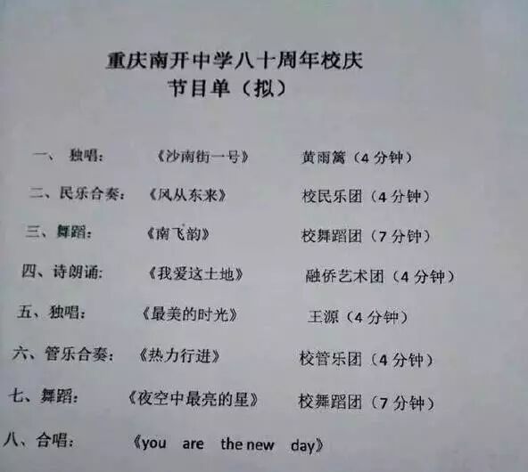 还记得当初一阵子源哥要说为母校为南开中学来唱歌的消息吗?这不节目单爆出了!