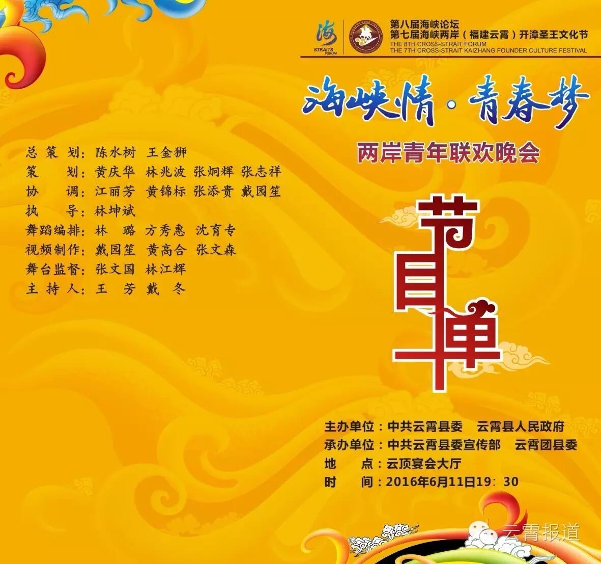 云报讯(林坤斌 文/ 供图)6月11日晚,、云霄县人民政府主办,县委宣传部、团县委承办的“海峡情•青春梦”两岸青年联欢晚会将在云顶宴会大厅上演,届时两岸三地的青年才俊将同台献艺,续写海峡情谊、青春梦想。