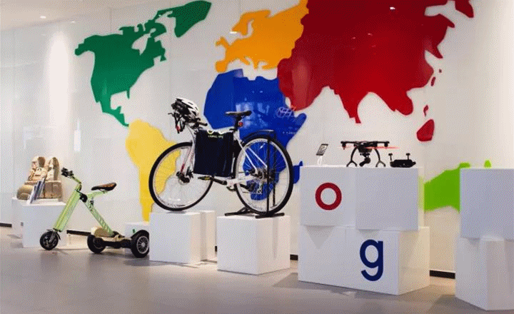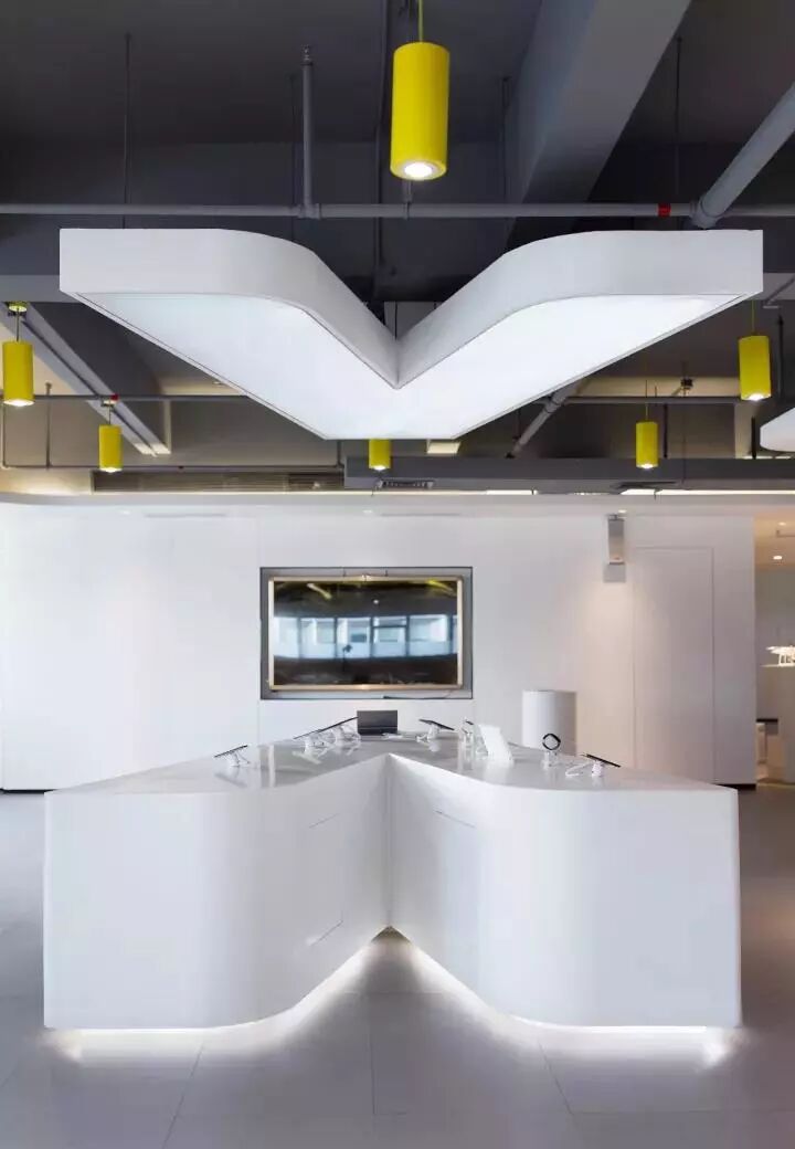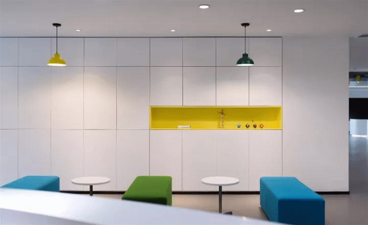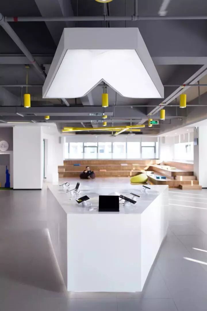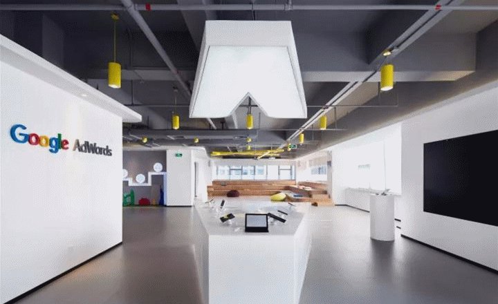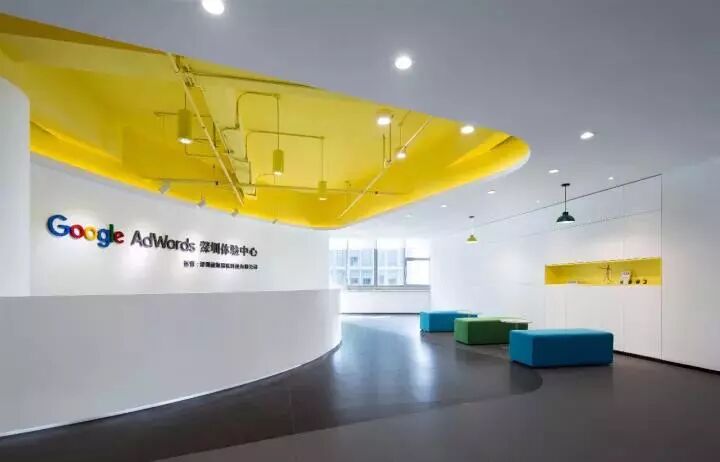 前厅天花以回环的造型围绕前台,并最终与背景融为一体,在这里体验中心与公司前台合二为一。休闲区作为本案中体验中心和员工办公区的共享区域,延续了Adwords标志元素,而谷歌的Logo形态在增添了空间趣味性的同时也兼顾了谷歌硬件展示。另一边的休闲区被设计成拾级而上的台阶,三两个慵懒的沙发,自然光线通过通透的玻璃散落在木制地板上,虽没有斑驳感人的光线落入,却也不失温和透亮。开敞的办公区融入谷歌的Logo色彩后显得缤纷而富有活力,颜色各异的体块,增添了办公生活中的趣味及生动,有效软化了办公相对硬朗、严肃的空间的对接。温暖和自然对应年轻和流行,一场充满时空交错,富有戏剧性的体验之旅在此开始。