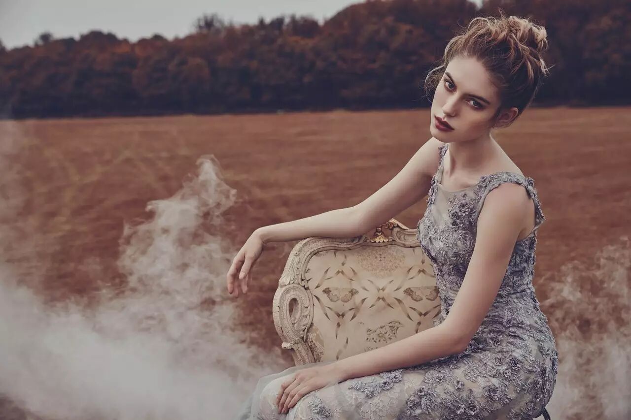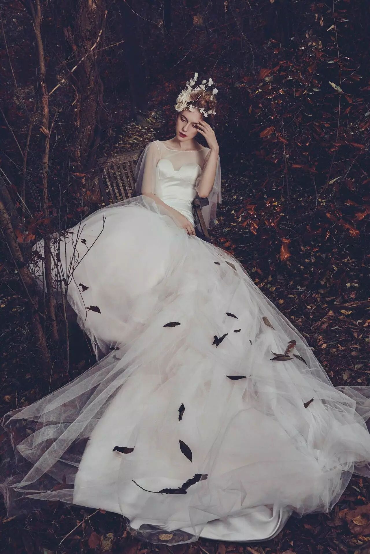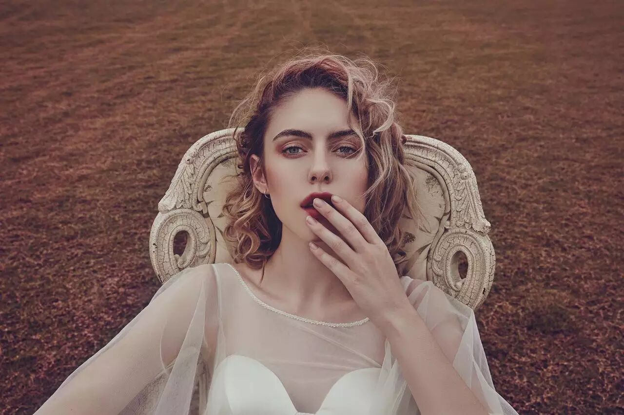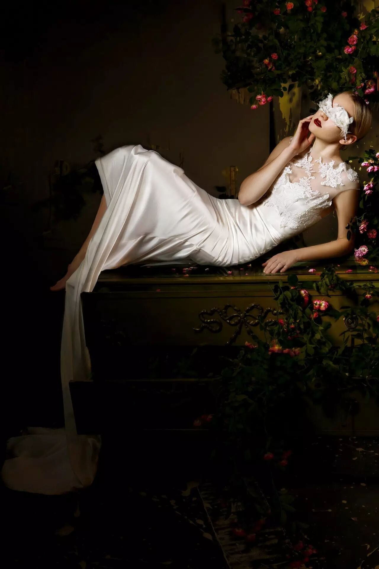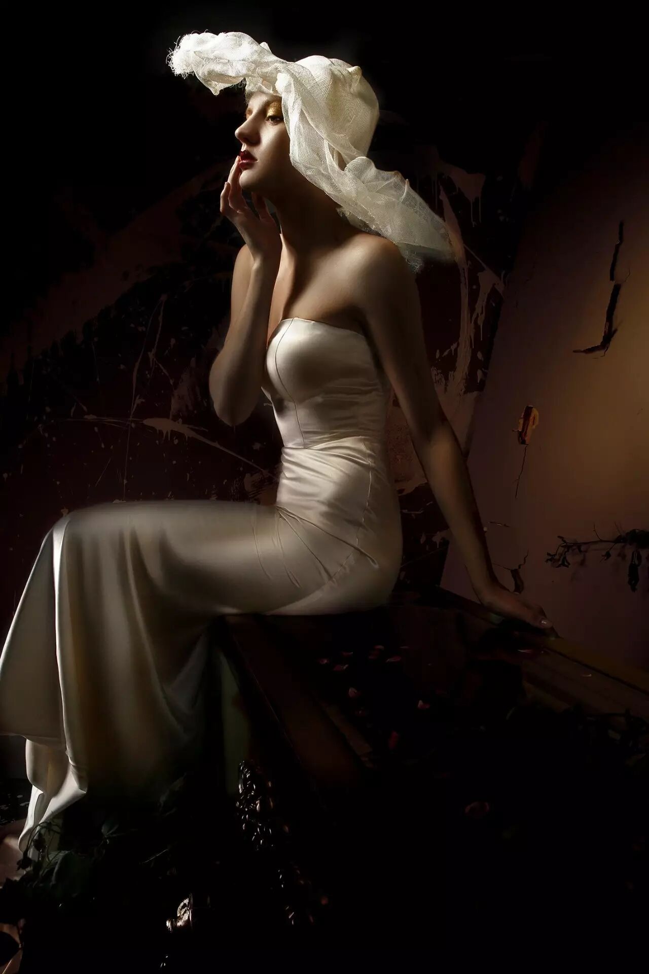 年轻姑娘的裙摆,化身为包容而优雅的Fontana di Trevi泉水,在涂满热烈而悲伤的色调中闪耀着;婀娜多姿的裙身,犹如天鹅的颈部洁白而柔美,妖娆的香肩上饰满蕾丝的花朵,散透着清凉的木香;她摆成一尊栩栩如生海神雕像的形态,沉睡在幽深花园的尽头,等待着香吻的传说;就连深爱着涂鸦的新娘,也难以割舍垂帘优雅的情分,轻盈的头纱,像是黎明破晓前的涤带,形成一道宁静的风景线;风一样的蒙面少女,露出幽禁在衣料的洞穴里诱人的肌肤,遥望着璀璨般的幸福。