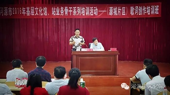 由河源市文化馆主办、源城区文化馆承办的“河源市2016年基层文化馆、站业务骨干系列培训活动(源城片区)歌词创作培训班”于 2016年5月6日正式开课。来自河源各县区文化馆(站)的业务骨干、各学校音乐骨干及群众歌词创作骨干约100余人参加了培训。