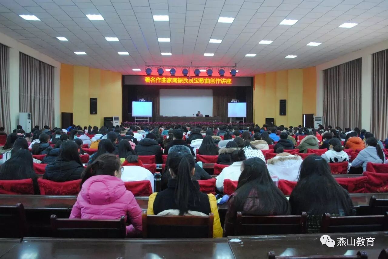为落实三门峡市委组织部“百名专家服务进基层”活动,2016年12月14日,著名作曲家南振民歌曲创作讲座在灵宝市实验高中成功举办。南振民,河南灵宝人,中国音乐家协会会员,,三门峡市音乐家协会主席。30年来,共创作、编曲音乐作品近千部,有400多部作品在省级以上发表和在各种演出中被使用,获国家和省部级奖项70多个。曾被授予河南省“八五建功先进个人”;三门峡市拔尖人才;三门峡市“五一劳动奖章”“和三门峡市劳动模范”等荣誉称号。由他创作的各种题材和类别的音乐作品,在各种演出活动中被使用,并多次获得大奖。