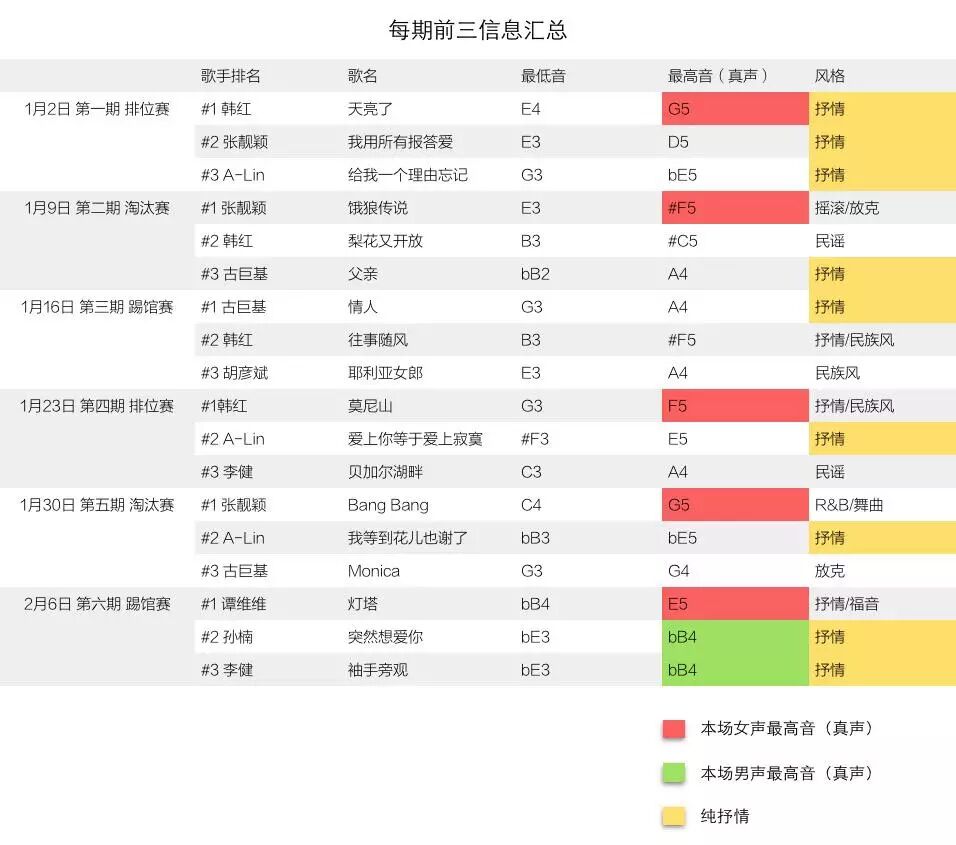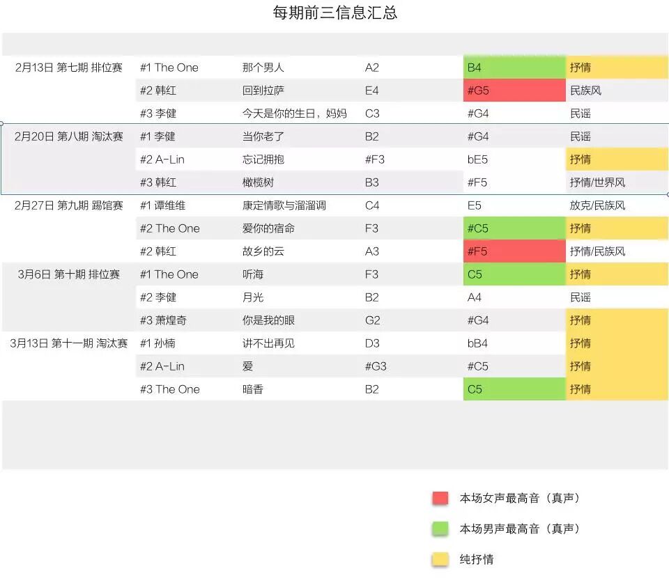 只考虑到每场的冠军有失偏颇,毕竟不只有第一名算得上“好名次”。那我们扩大范围,列出十一场竞演中每场前三名唱的歌的最高音(如下图),会发现33首歌中只有13首歌唱到本场的最高音。